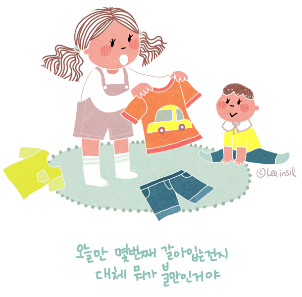만 30개월 된 여자아이를 키우는 엄마에요. 아이가 하루에도 옷을 몇번씩 갈아입는지 모르겠어요. 옷에 물이 조금만 묻어도 젖었다고 짜증을 내면서 옷을 갈아 입어요. 잘 놀다가도 갑자기 옷을 갈아입곤 한답니다. 게다가 여자옷 보다는 남자옷을 더 좋아하는 것 같아요. 만 15개월 된 남자동생이 있습니다만, 무엇이 문제인지 답답해요.