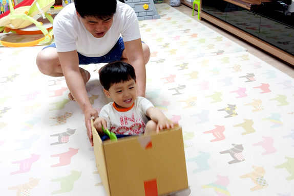 바깥놀이가 어려운 날은 거실에서 신나는 종이박스 자동차를 타 보아요.